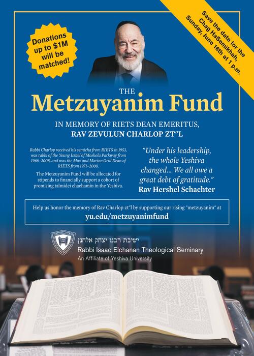Our Dean Emeritus, Rabbi Zevulun Charlop Zt"l, was a pillar of the RIETS community for decades and aided countless talmidim (or, as he would say, "metzuyanim") on their path to becoming rabbanim. As we prepare to celebrate the Chag HaSemikhah, we are privileged to establish the Metzuyanim Fund in his memory to financially support a yearly cohort of promising talmidei chachamim learning in our kollel. Thanks to a generous donor, contributions will be matched up to $1 million! Please consider supporting our rising metzuyanim in order to continue the tradition of excellence and success in learning that Rabbi Charlop embodied. Donations can be made at https://ru.mrmhk.shop/MetzuyanimFund